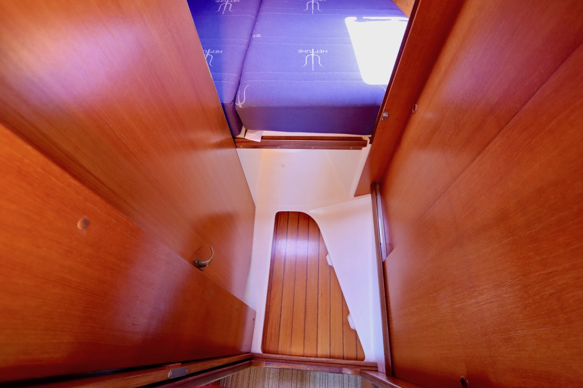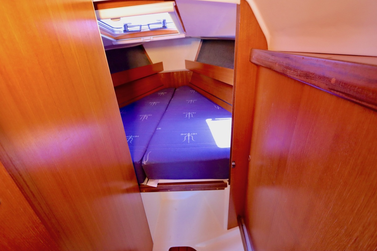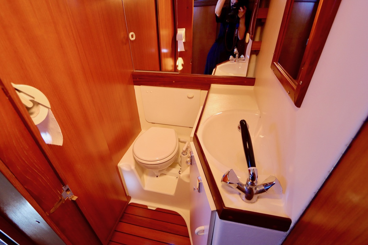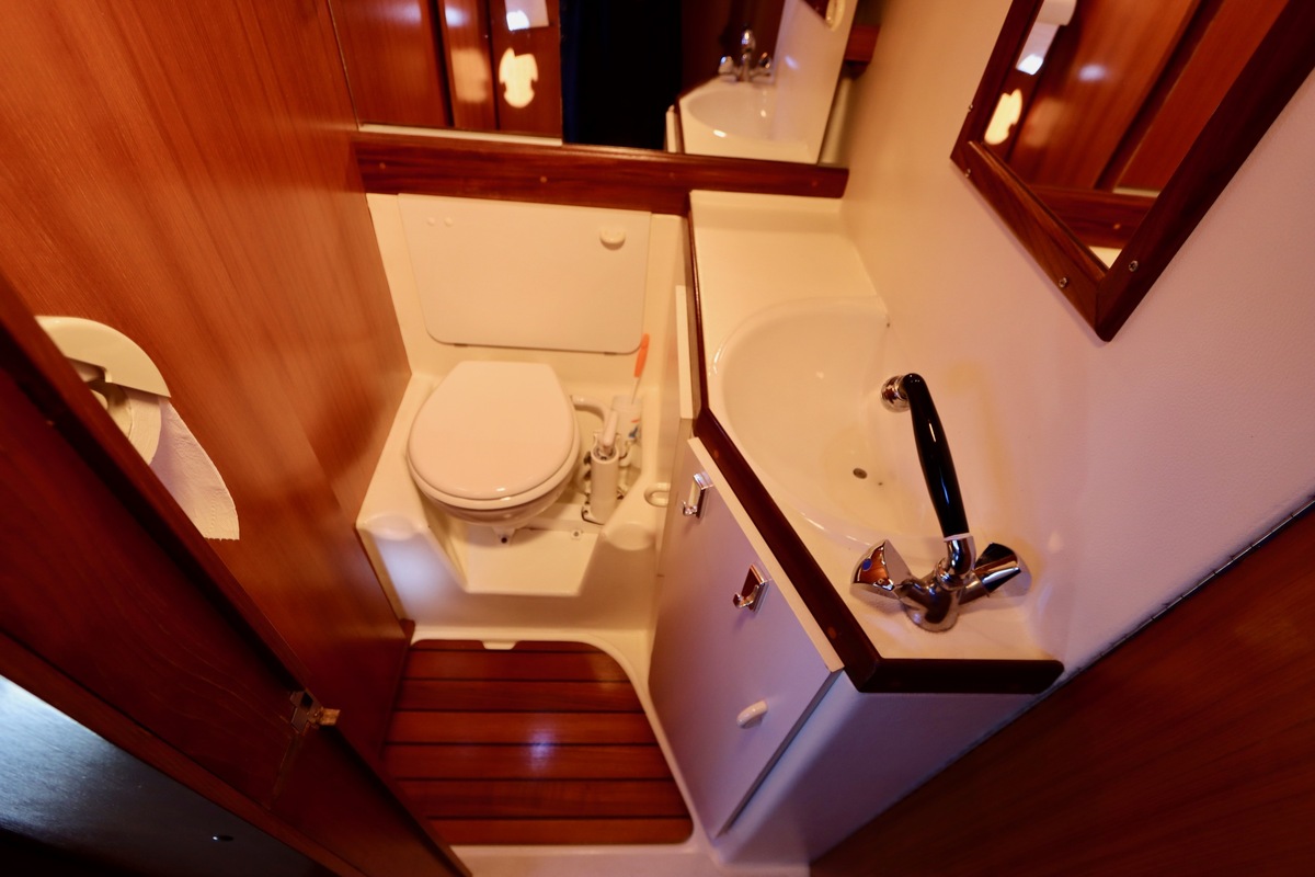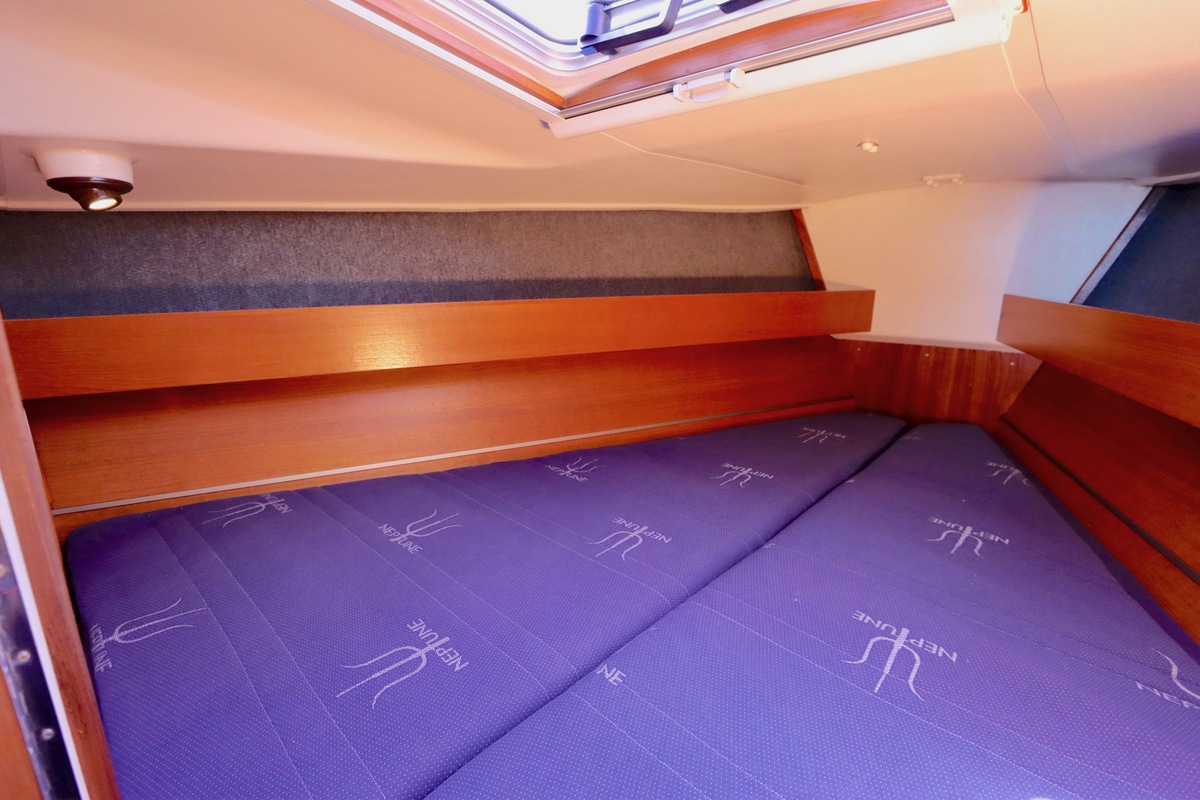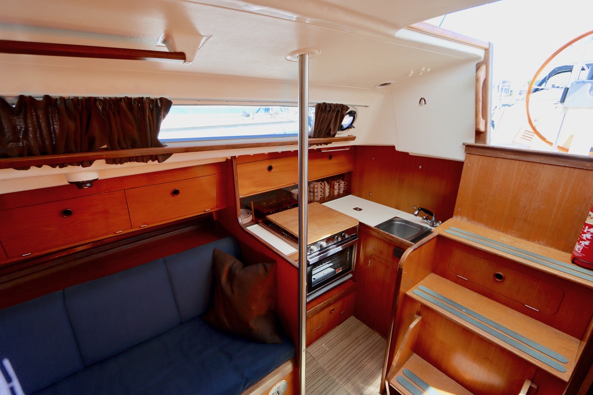 3 burner stove with oven on gas, built in 1988, no gas certificate availableCentral cabin with lots of natural light, galley and navigation corner and lockable aft cabin. To the fore cabin a forepeak with toilet and washbasin that can be closed off by means of a sliding door and a lockable sleeping compartment with Neptune mattresses (2017) and slatted bases. Both the lockable aft cabin and fore cabin have ventilation options by opening portholes and deck hatch in the fore cabin.