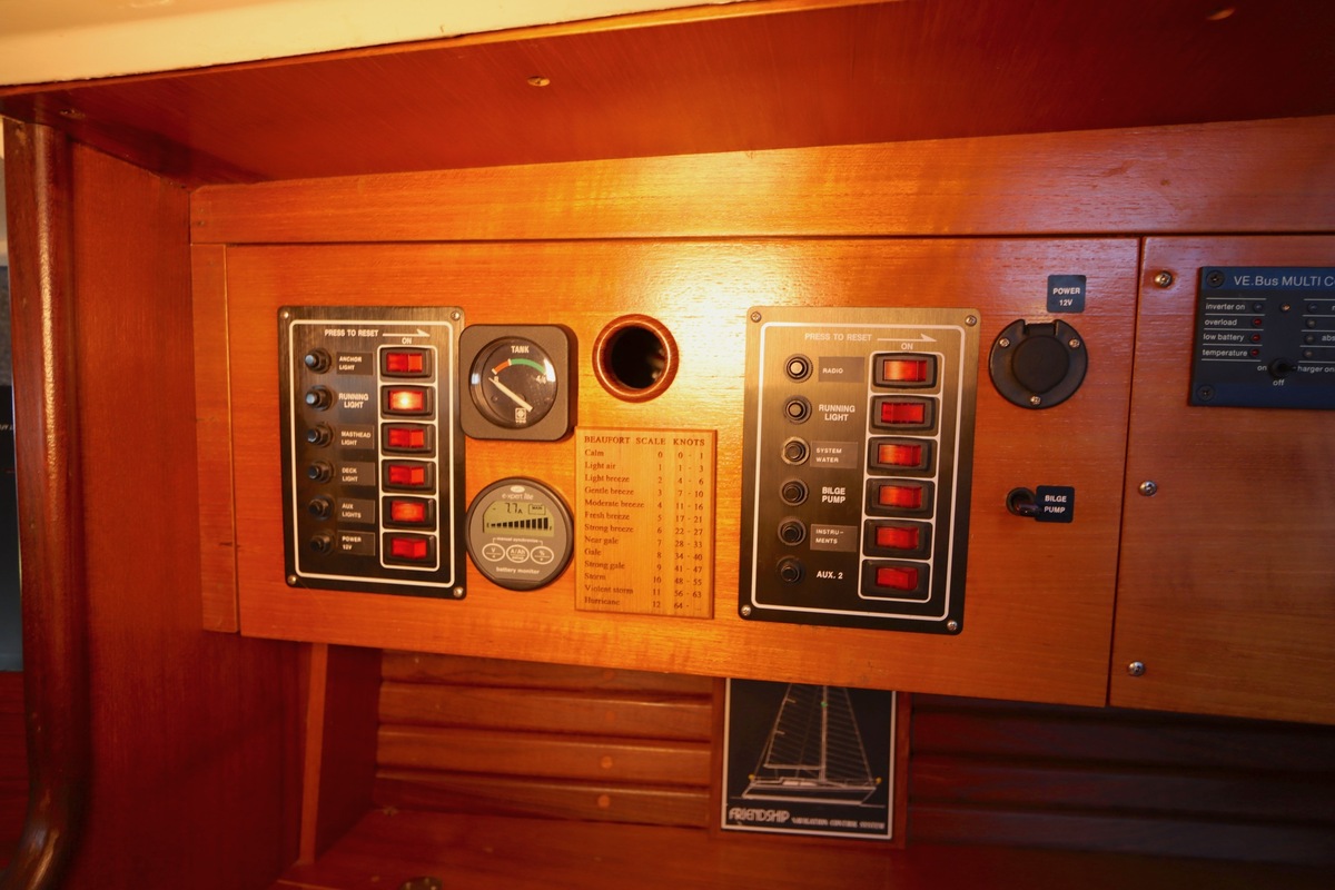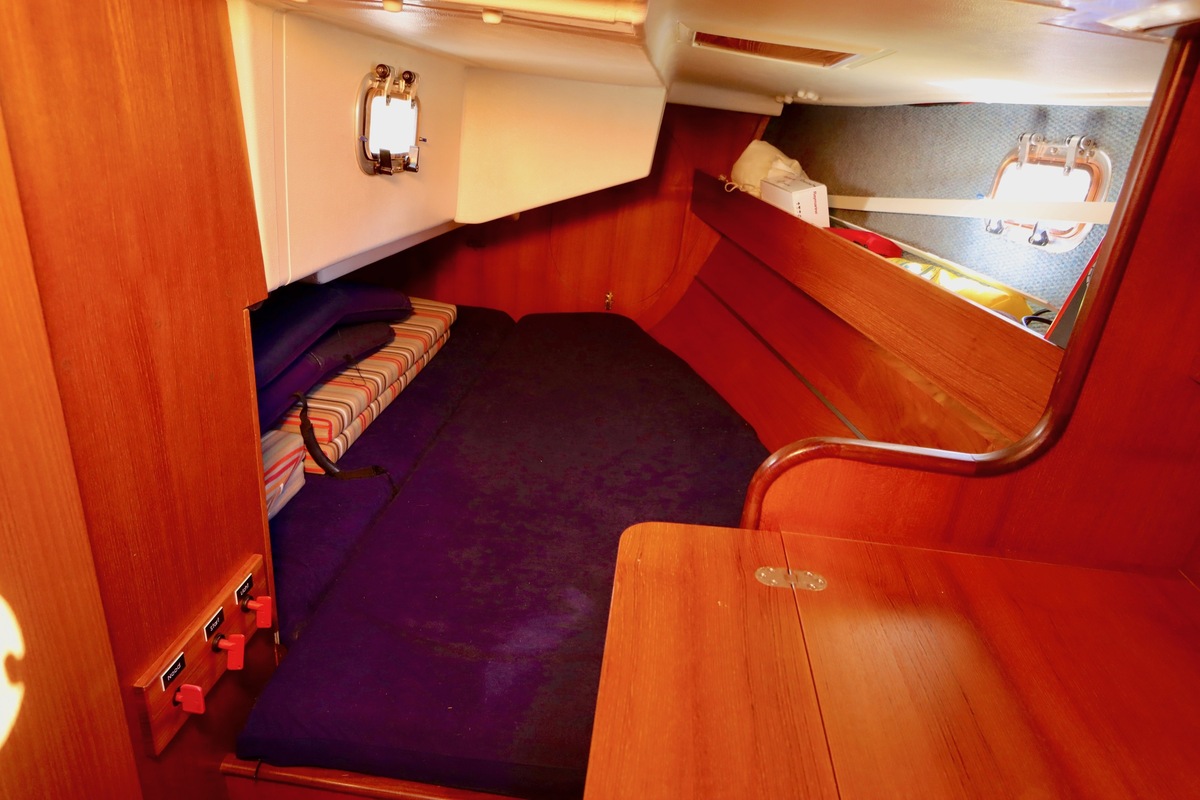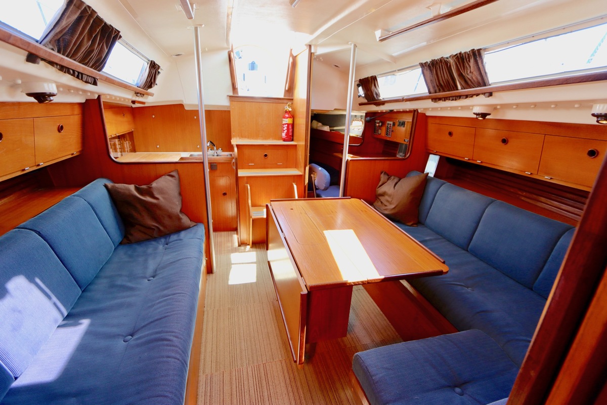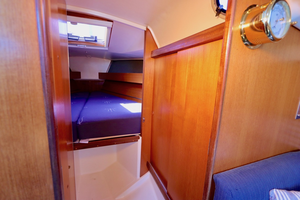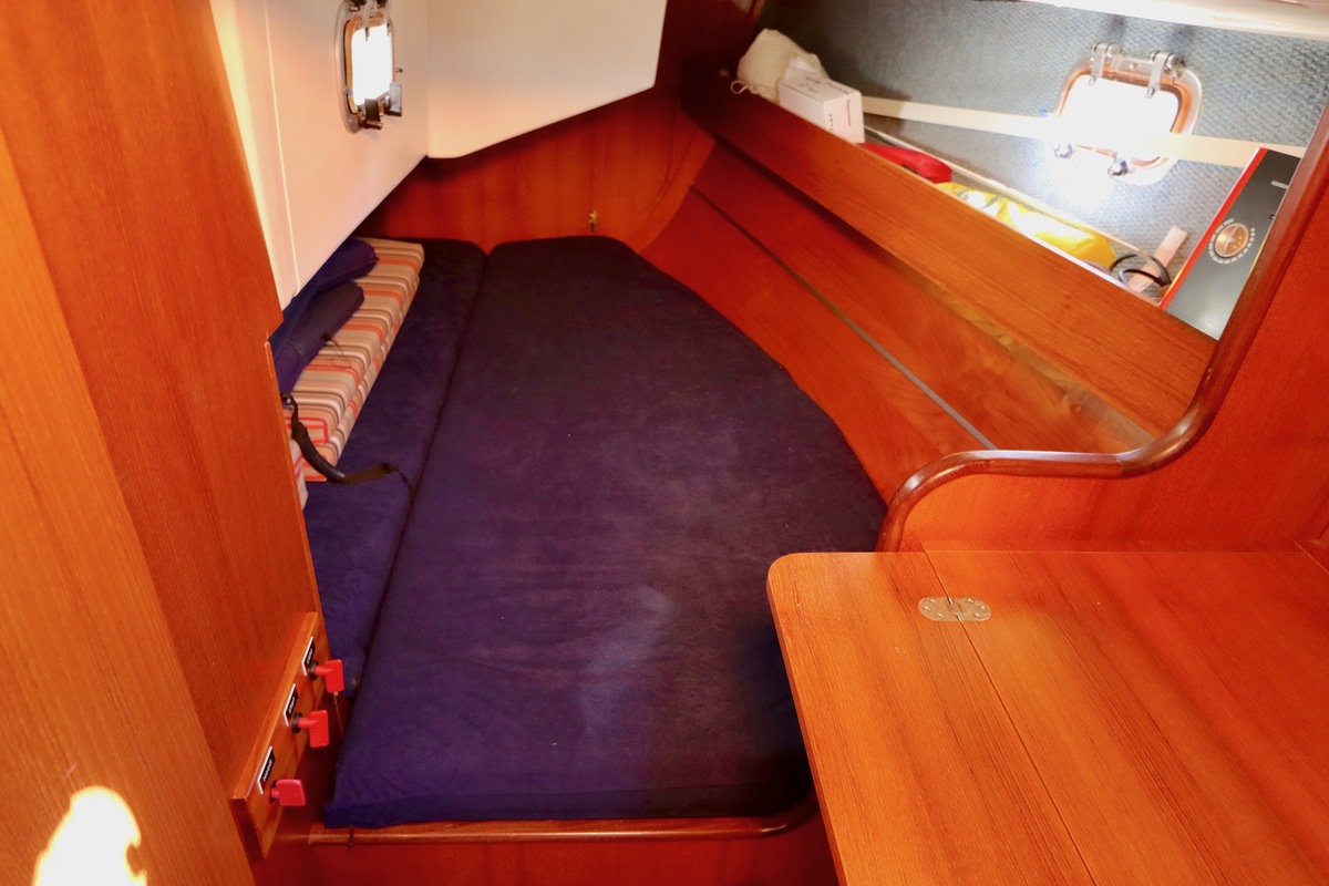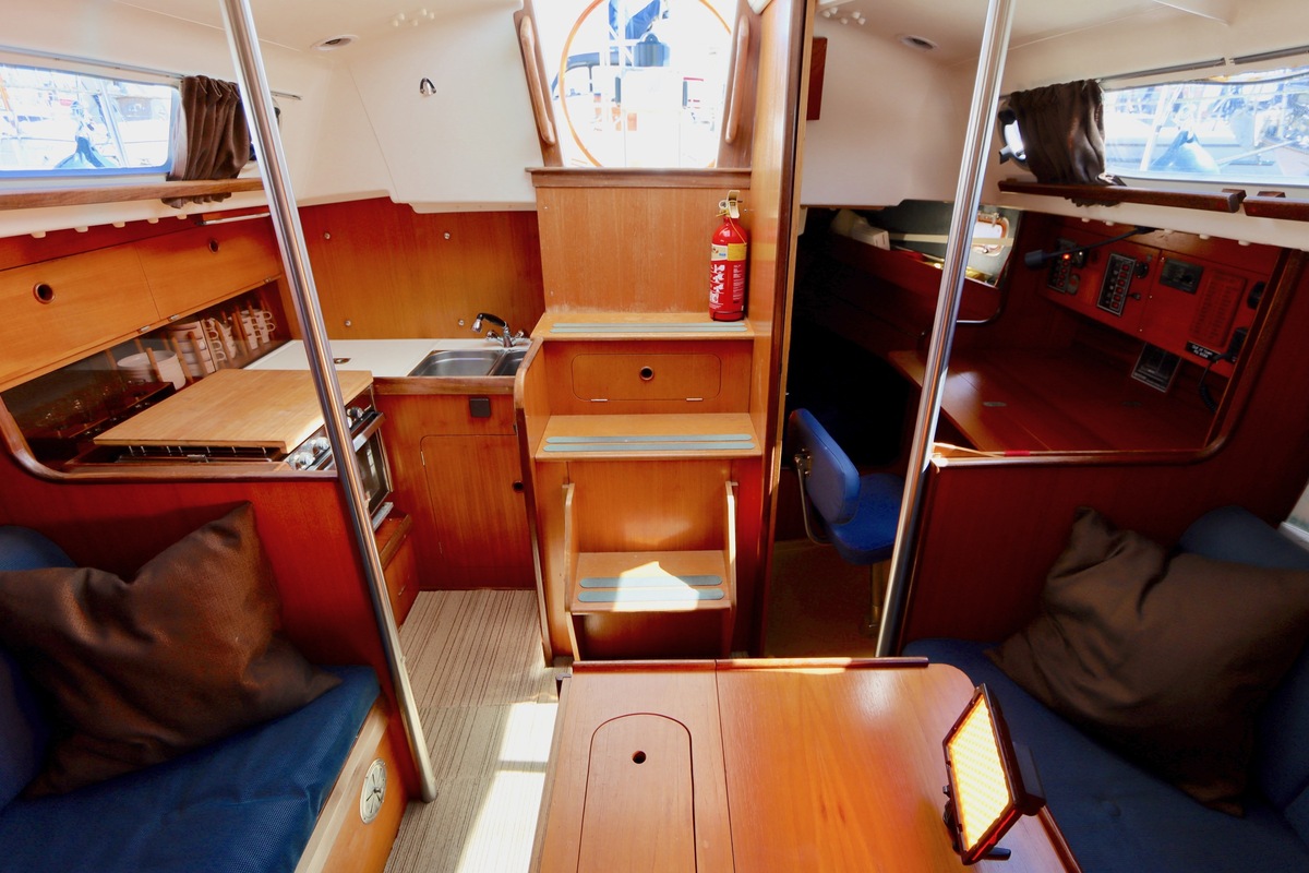 3 burner stove with oven on gas, built in 1988, no gas certificate availableCentral cabin with lots of natural light, galley and navigation corner and lockable aft cabin. To the fore cabin a forepeak with toilet and washbasin that can be closed off by means of a sliding door and a lockable sleeping compartment with Neptune mattresses (2017) and slatted bases. Both the lockable aft cabin and fore cabin have ventilation options by opening portholes and deck hatch in the fore cabin.