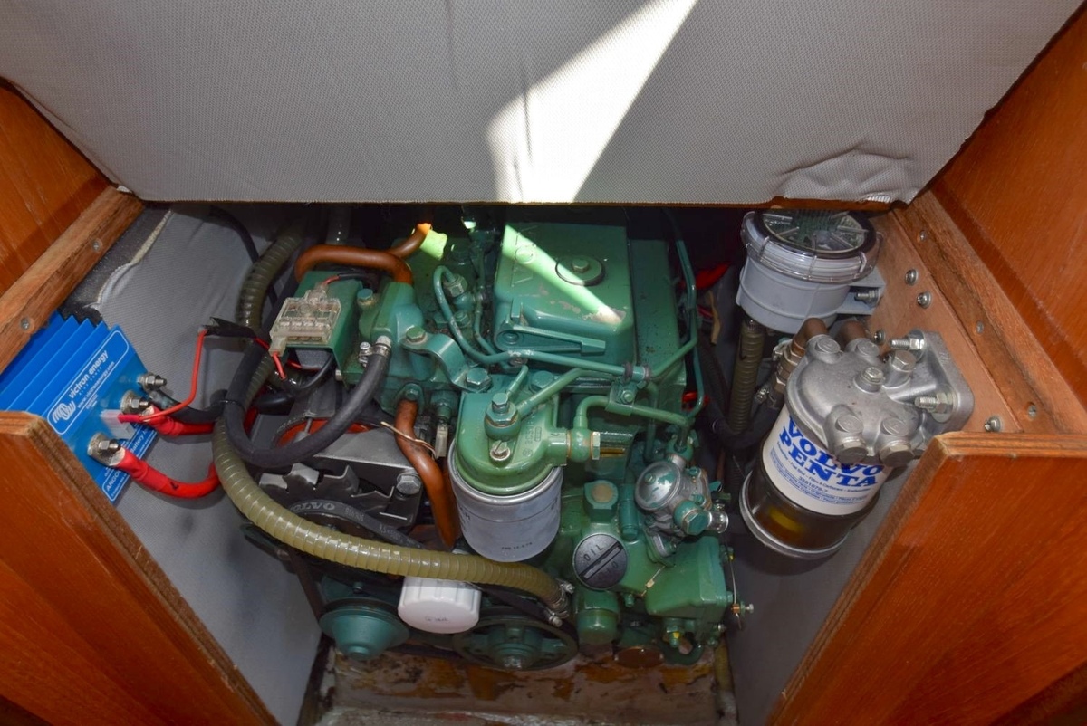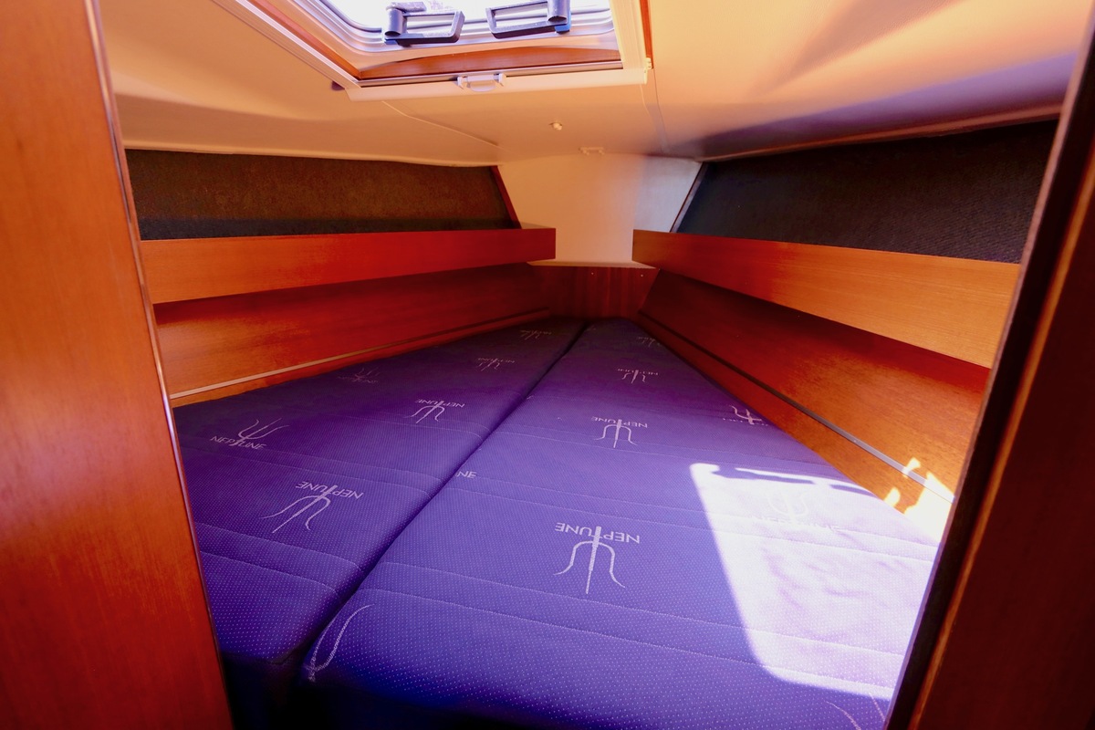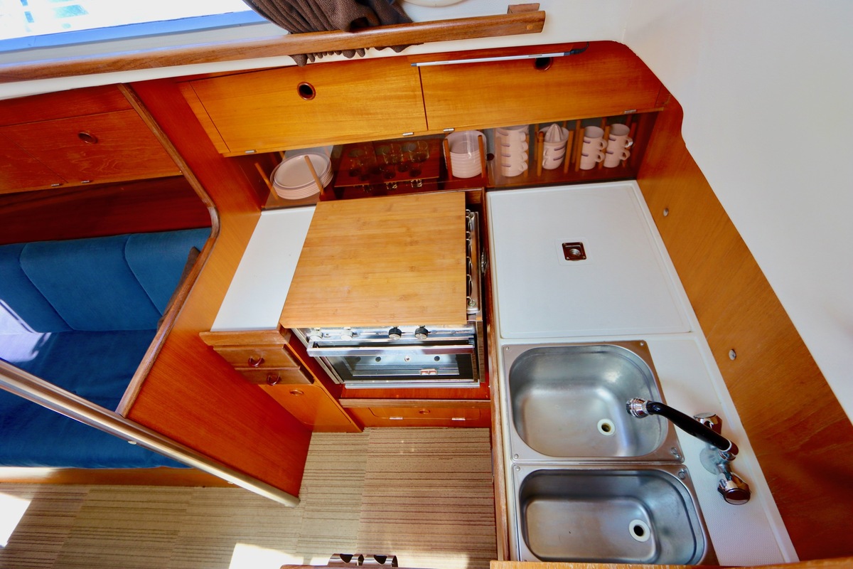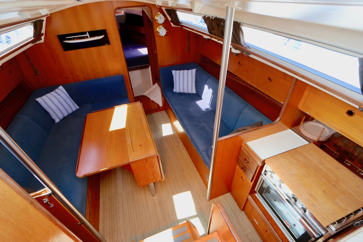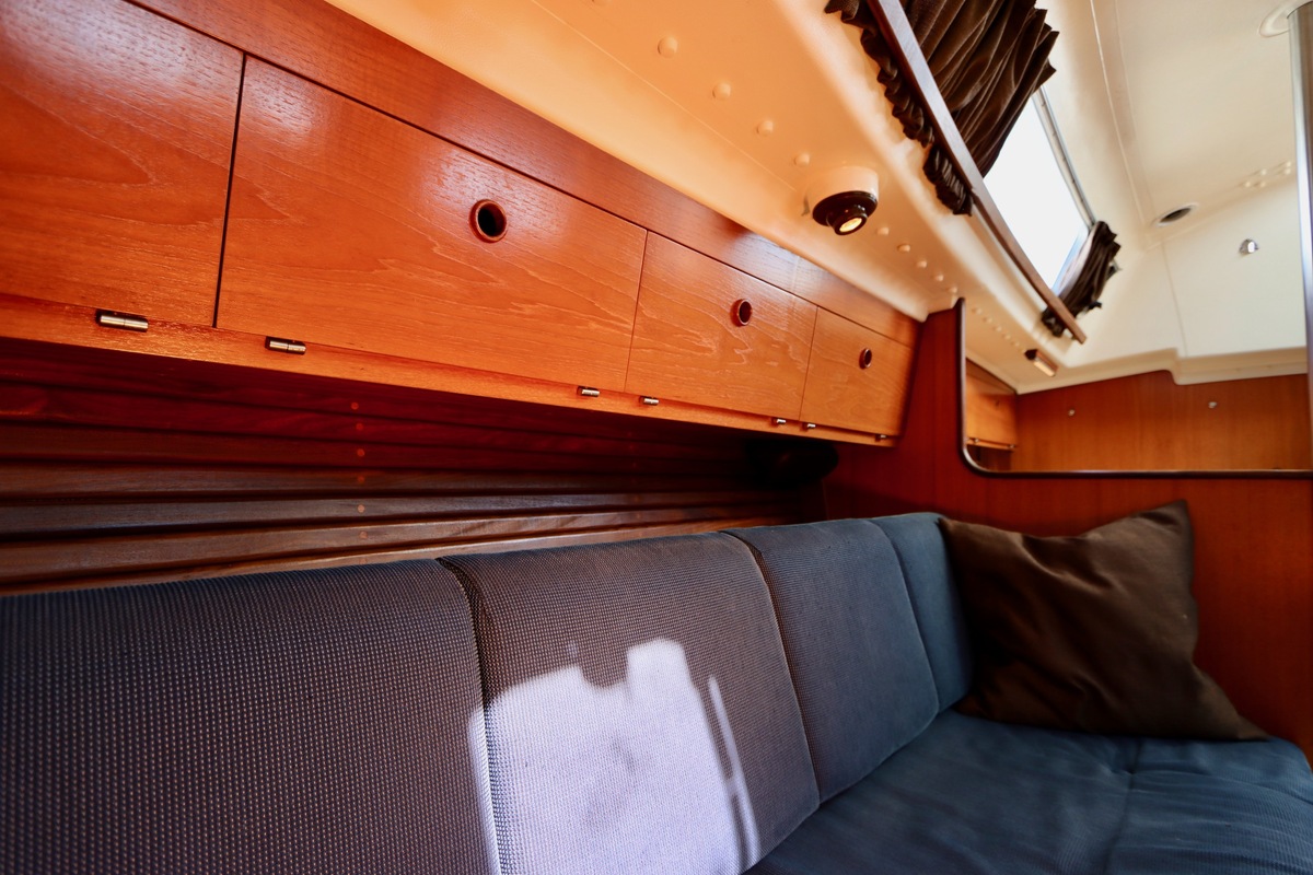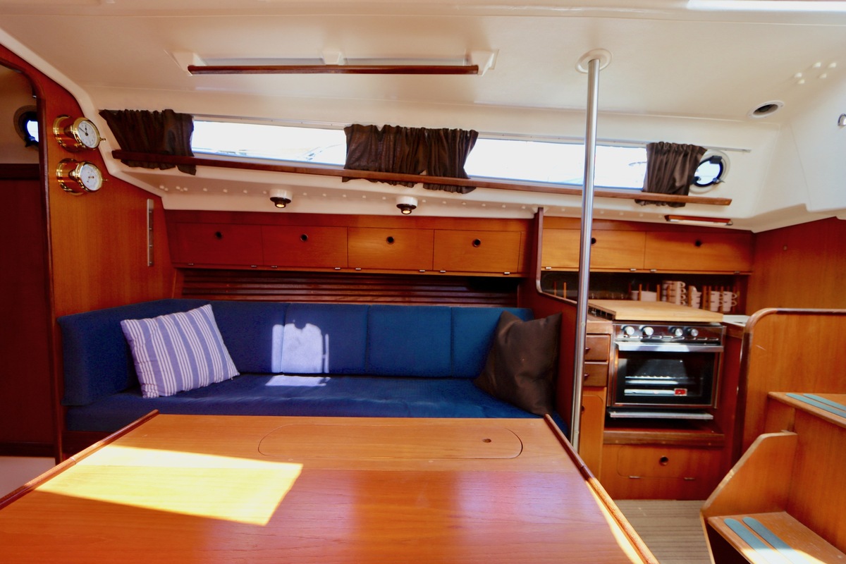 3 burner stove with oven on gas, built in 1988, no gas certificate availableCentral cabin with lots of natural light, galley and navigation corner and lockable aft cabin. To the fore cabin a forepeak with toilet and washbasin that can be closed off by means of a sliding door and a lockable sleeping compartment with Neptune mattresses (2017) and slatted bases. Both the lockable aft cabin and fore cabin have ventilation options by opening portholes and deck hatch in the fore cabin.