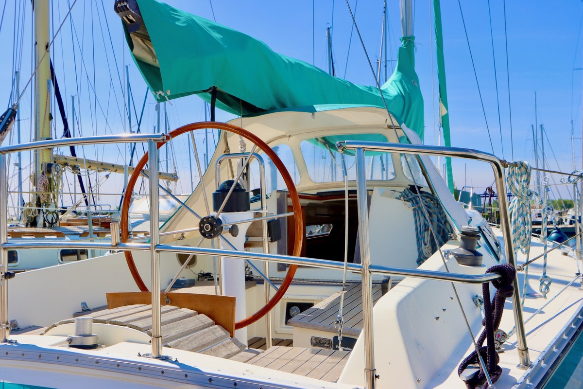Raymarine EVO Quadrant autopilot, including laminated foundation and reinforced transom, controls at helm and computer in aft cabin.
