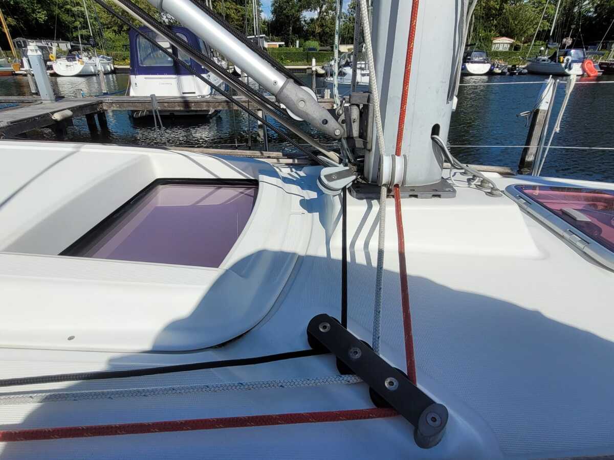 The round bilge hull is made in blue polyester, with a white deck and a sleek, modern look. The cockpit features wheel steering, and the uncluttered layout makes the boat easy to handle, even with a small crew. The rigging is fractional, with a Dacron mainsail and genoa (2010) and four Harken self-tailing winches. The mainsail is battened and has a hood; the genoa is equipped with a furling system.